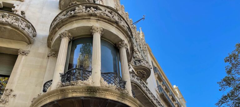 The facade is adorned with sculptural elements, floral motifs, and intricate wrought ironwork framing the elaborate windows and balconies, the result of a collaboration between architect, artists and craftsmen typical of the Catalan modernist movement’s quest to create a total work of art. Casa Lleó Morera exemplifies the elegance and craftsmanship of Catalan modernism, reflecting Domènech i Montaner’s commitment to creating immersive spatial experiences.