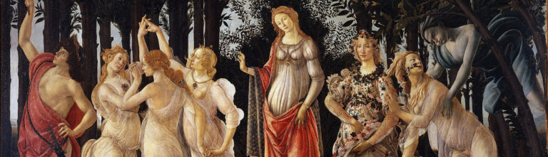 The complicated allegory combines elements from the classical authors Ovid and Lucretius as well as the Renaissance poet Agnolo Poliziano. From the left, we see the messenger god Mercury poking at tree boughs laden with fruit; next to him, the Three Graces dance charmingly in provocatively diaphanous robes, while the figure at the center of the composition is likely Venus, above whom the blindfolded Cupid aims his love-bearing arrows. To the far right, the bitter wind Zephyrus chases the nymph Chloris, who transforms into the flower-covered Flora, the goddess of Spring. Demonstrating Botticelli’s amazing attention to detail, over 200 distinct species of plants can be identified in the painting.