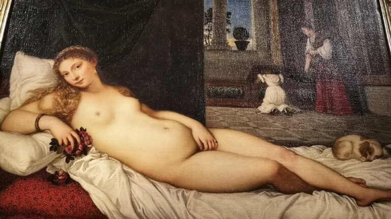 The painting was probably commissioned by Guidobaldo II della Rovere on the occasion of his marriage to the young Giulia Varano, and was completed in 1538. Titian’s masterful ability to conjure the different textures of various fabrics and materials, and above all his ability to render human flesh in all its living vitality, remains astounding to this day.