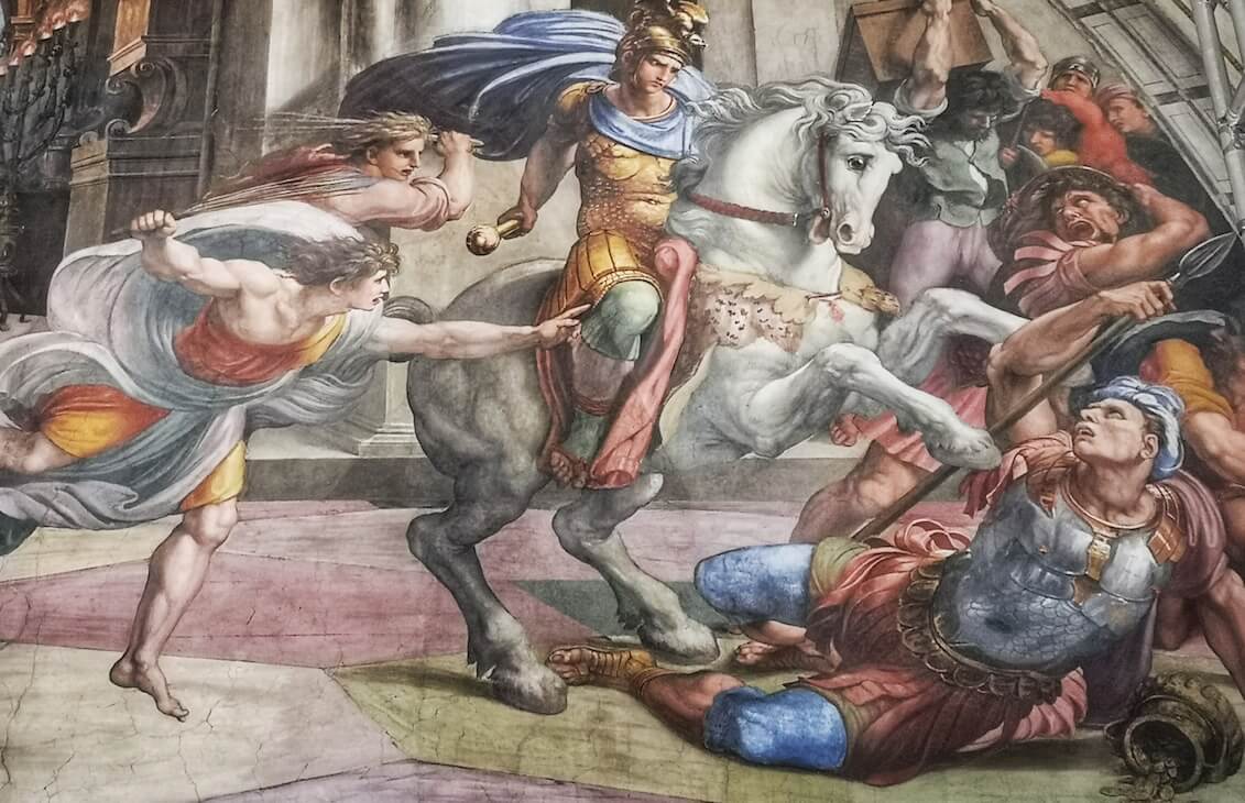 Don’t miss the beautiful but seemingly out of place black-and-white portrait head in one of the lunettes on the far wall, long-rumoured to be a brilliant prank pulled on Raphael by his great rival Michelangelo when he snuck in to see how the work was progressing (scholars now attribute the work to Peruzzi).