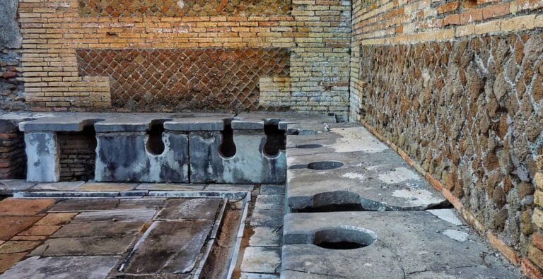 Ostia’s communal public latrines reflect advanced Roman plumbing. A marble bench with 20 seats led to a drainage system flushed by water. Patrons used sponges on sticks for hygiene, showcasing the Roman solution to bathroom needs in antiquity.