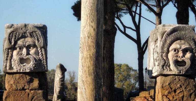 Ostia’s ancient theater, built in the 1st century BC, could seat up to 4,000 people. With its impressive cavea and decorated stage backdrop featuring glaring theatrical masks, it’s one of the best-preserved examples of Roman theaters anywhere – and is still used today for concerts and theatrical events!