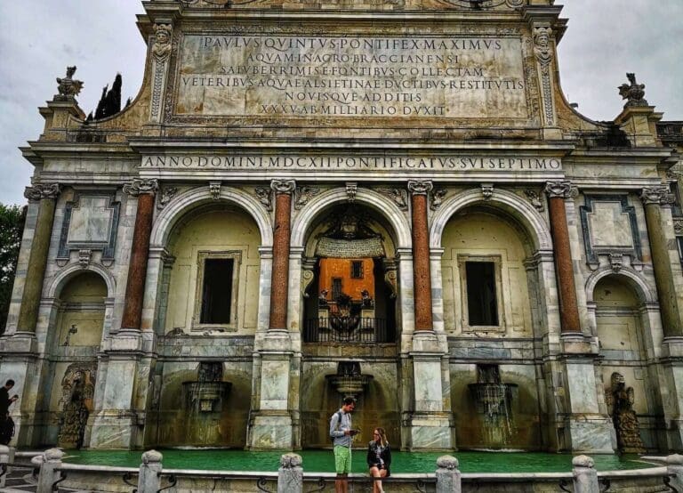 Spectacularly situated high on the Janiculum hill and boasting extraordinary views over the city, the immense Fontana dell’Acqua Paola is one of Rome’s most imposing fountains, for good reason known as Il Fontanone. Constructed in 1612 to commemorate the restoration of the Aqua Paola aqueduct during the reign of Pope Paul V, the aqueduct finally brought clean drinking water to the west side of the Tiber for the first time since antiquity. The monumental celebratory fountain was designed by Giovanni Fontana and Flaminio Ponzio, and takes the form of five massive arches welcoming five torrents of rushing water into the huge basin. Much of the marble used in the fountain was taken from the ancient ruins of the Temple of Minerva in the Forum of Nerva, whilst the beautiful pink granite columns were taken from Old St. Peter’s Basilica.