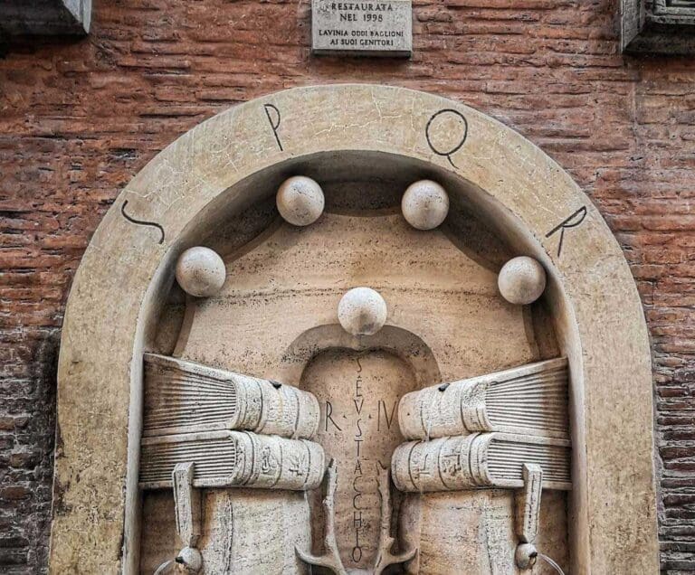 One of our favourite lesser-known fountains in Rome is the Fontana dei Libri – the Fountain of Books – just a few steps from Piazza Navona. Designed by Pietro Lombardi in 1927, the fountain is the most modern entry on our list and pays homage to the San Eustachio district as a historical centre of learning – the first university in Rome, La Sapienza, opened its doors right here in the 1300s. The fountain’s central deer’s head refers to a legend about the eponymous Saint Eustace himself, a hunter to whom Christ spoke through the guise of a deer.