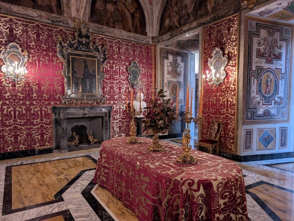 Step beyond the grandeur of the main galleries and discover a more intimate side of Palazzo Colonna as your guide leads you into the private world of Princess Isabelle’s apartments. Tucked away from the ceremonial splendor of the Great Hall, these richly decorated state rooms and personal chambers offer a rare glimpse into aristocratic life behind closed doors. Here, gilded mirrors, family portraits, antique tapestries, and lovingly preserved furnishings speak of generations of privilege and refinement.