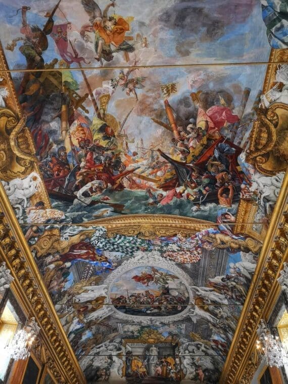 Above, exuberant frescoes animate the ceiling with the swirling drama of the 1571 Battle of Lepanto, when Italian fleets commanded by Marcantonio Colonna defeated the fearsome Ottoman navy. This was one of the greatest triumphs in the story of the Colonna family, and it’s given a truly spectacular showcase here: gaze up as Italian galleys cleave through painted waves, Turkish vessels billow in exotic finery, and Marcantonio himself is received into heaven by the Virgin Mary in a blaze of celestial radiance.