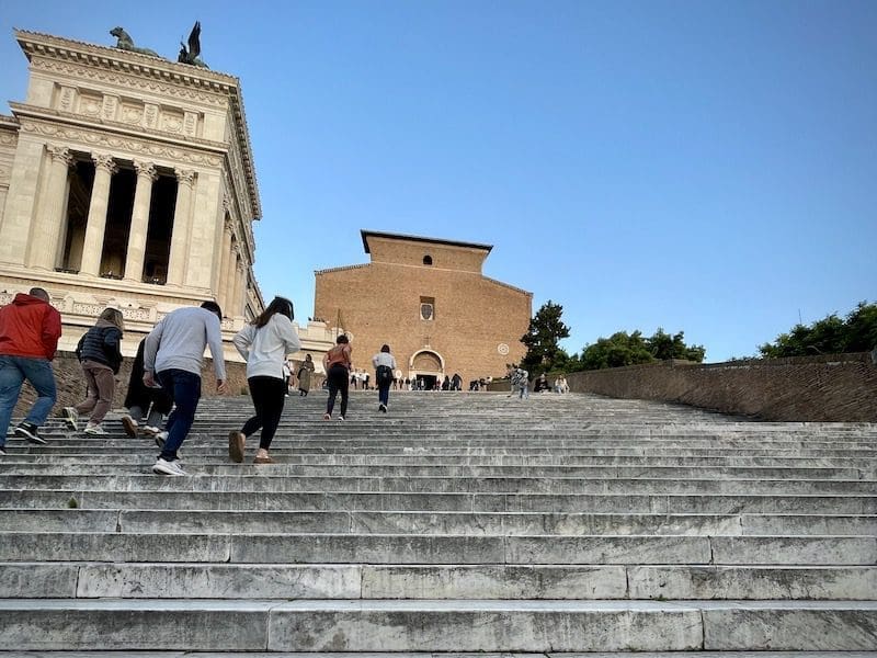Your private Rome tour will then take you to the legendary Basilica of Santa Maria in Aracoeli nearby, built over the remains of the ancient Temple of Juno Moneta in the 6th century AD. By this time the Roman Empire had fallen, and during the Middle Ages new places of worship were built over the ruins of Rome’s once splendid classical monuments. The Basilica’s remarkable cosmatesque floor of multi-colored tiles is one of the most superb testaments to the splendors of medieval art in Rome: your guide will give you the lowdown on the painstaking technique that made them possible as well as how the craftsmen re-used ancient marbles.