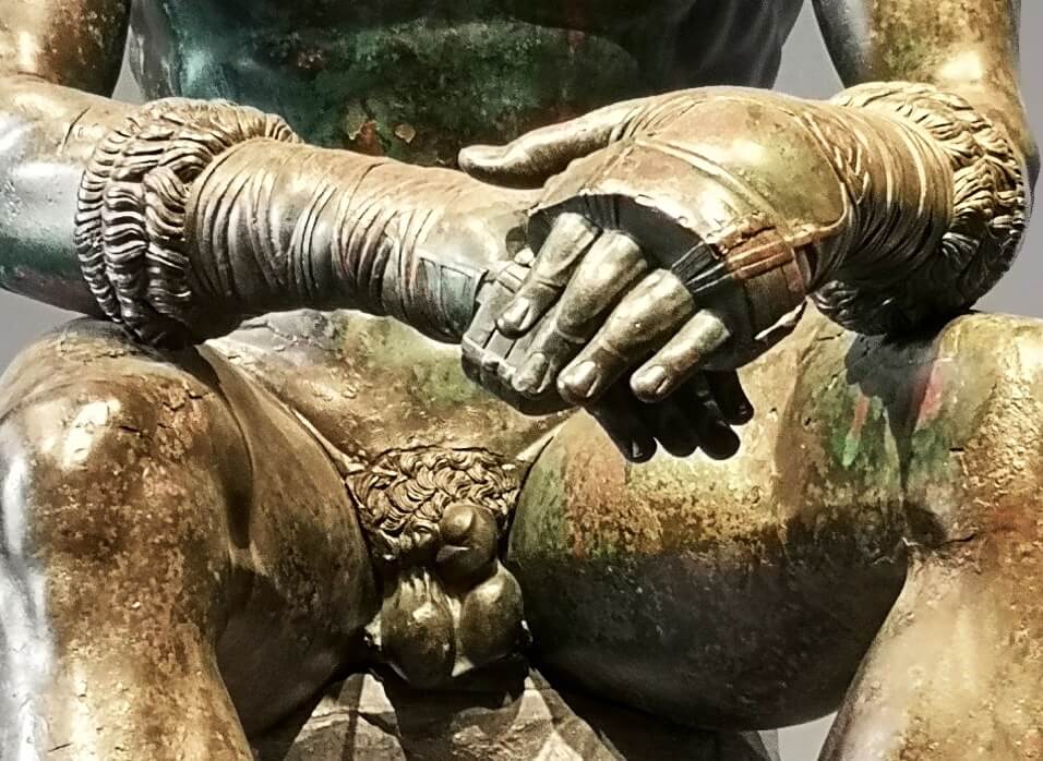 We can learn a lot too about the practices of ancient boxing from this incredible sculpture. The fighter’s manly member is discreetly tied away, infibulated by means of a kynodesmē or ‘dog tie,’ a strip of leather that ensured the boxer’s penis wouldn’t flap about indecorously during the contest. Of course, the kynodesmē wasn’t only aimed at decorum – as the pugilists conducted their bouts in the nude, it also protected the combatants from painful low blows.
