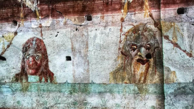 The decoration of the domus is predominantly in the Second Pompeiian Style, distinguished by vibrant colors, intricate geometric motifs, and illusionistic architectural elements that create a striking sense of depth and three-dimensionality. Among the most remarkable spaces is the Room of the Masks, a cubicula where theatrical masks peer down from the walls, set within brilliantly colored, stage-like architectural frameworks that evoke the drama of the ancient theatre. Nearby, the Room of the Pines offers a more serene atmosphere, its walls adorned with delicate pine branches and Doric columns that suggest a quiet, naturalistic retreat.