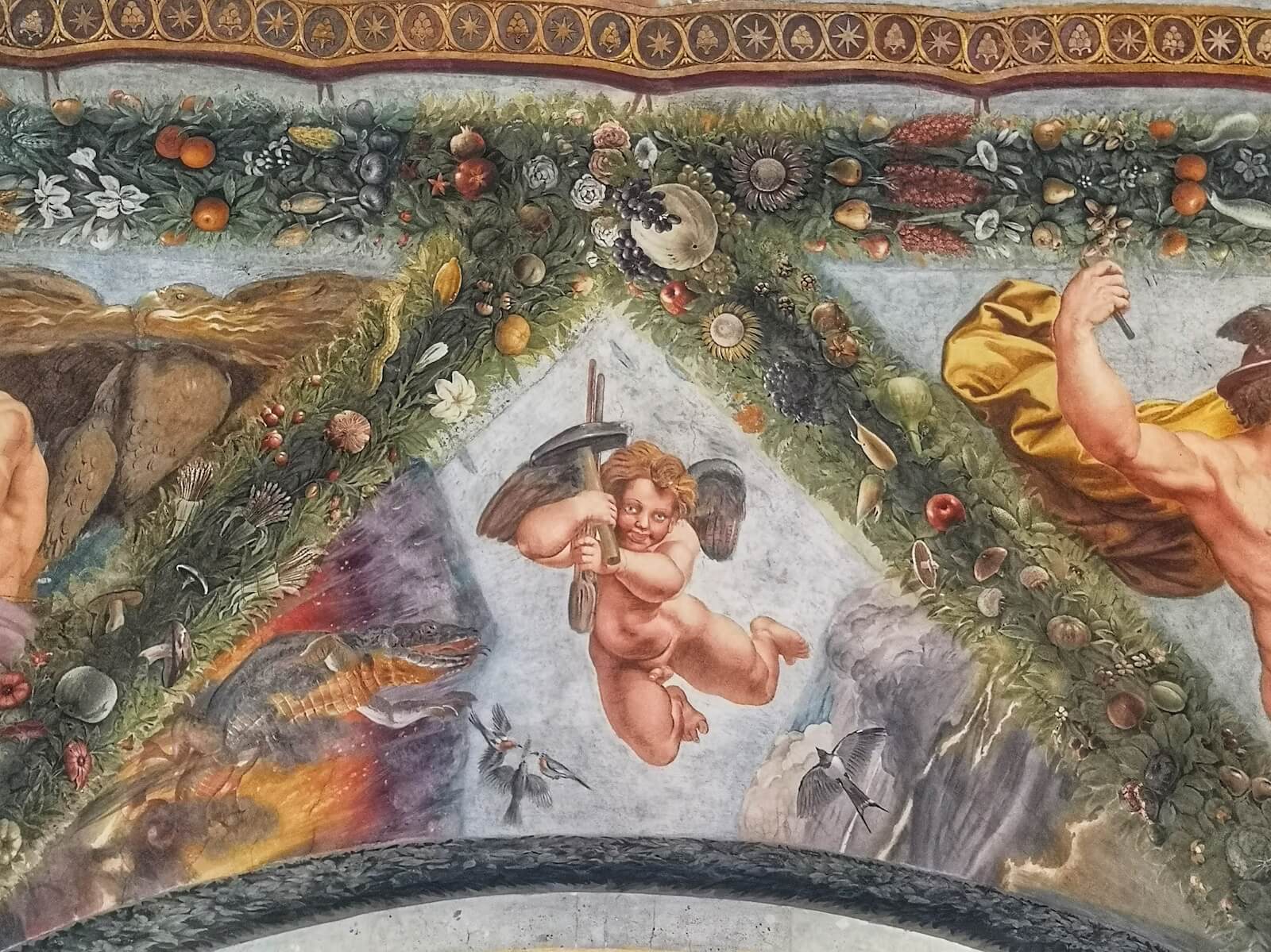 The Hall of Cupid and Psyche transports the visitor to a mythical world of exuberant beauty and festivity. The innumerable vicissitudes of the beautiful Psyche and her tormented affair with the no-less-beautiful and divine Cupid are suspended on the immense ceiling among gigantic depictions of garlands of flowers and fruits; the effect is truly spellbinding. The narration culminates in the central scene of the wedding banquet celebrated by Cupid and Psyche, in the presence of all the gods of Olympus, under a shower of flowers and perfume. Divine celebration for the greatest love story of all time…