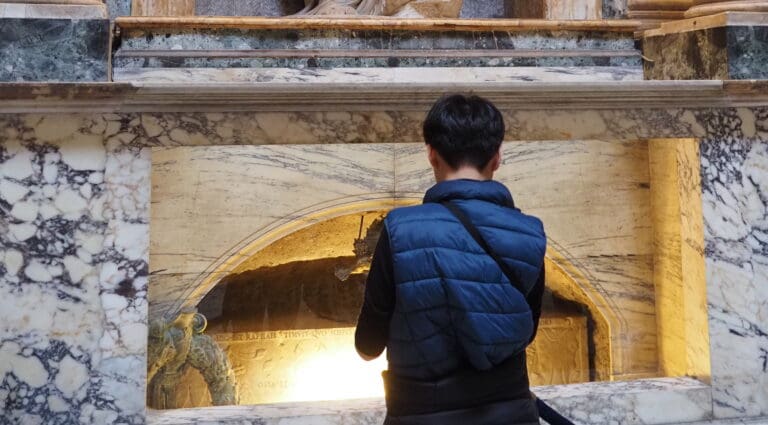 The Pantheon was converted into a Christian church during the pontificate of Boniface IV at the beginning of the 7th century, and you can still see a holy object that was installed in the newly sacred space shortly after its Christanization. This is a Byzantine icon portraying the Virgin Mary holding the Infant Christ. Although we don’t know exactly when the icon was made, we know that it was in the church in the year 770, when a renegade priest who took refuge in the Pantheon after a failed seditious plot was recorded as clutching it to his body for protection.