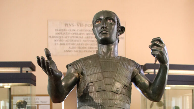 The statue was commissioned to celebrate the emperor’s victory over the Parthian people in 20 B.C., and features a youthfully energetic Augustus right at the top of his game. As if to underline his success, the imperious emperor wears a distinctive military cuirass decorated with a scene depicting the recovery of a military standard lost by the Roman legions 70 years earlier. In 2004, a reconstruction of the statue’s originally polychromatic appearance by the Vatican’s conservators caused a massive stir, and the debate as to what extent the sculpture was painted still rages.